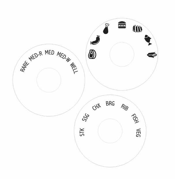 Hay dos ajustes, uno elige el tipo de carne, el otro elige el nivel de cocción. Descargar el disco diseño jpeg en su tamaño original o imprimir desde Illustrator. Si lo desea, puede utilizar papel blanco liso, o algo un poco más pesada. Adjunto también son los archivos .ai para modificarlos para incluir el tipo de comida que te gusta a la parrilla.