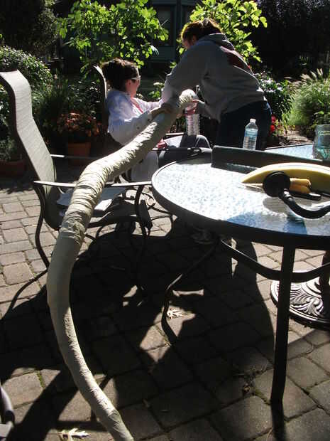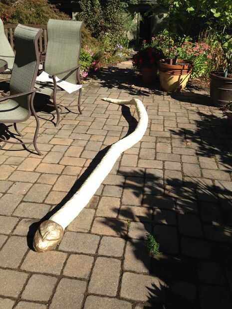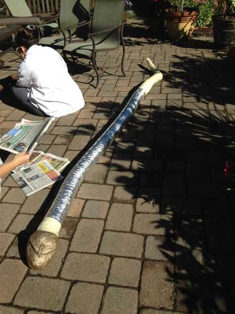 La cabeza fue unida con tanto pegamento del gorila en el interior del conducto y cinta de enmascarar (la clase barata de la tienda de dólar). La cola era cónico con tiras de chatarra de tallarines de la piscina dejado de hacer las serpientes para la puerta de la cámara de los secretos. Las tiras de tallarines de la piscina se cortaron en longitudes y empujó en el extremo del conducto y rodeadas con cinta adhesiva para crear la cola. El resto del conducto que forman el cuerpo de la serpiente también estaba envuelta en cinta adhesiva para crear una superficie viable que pintura o pegamento.
