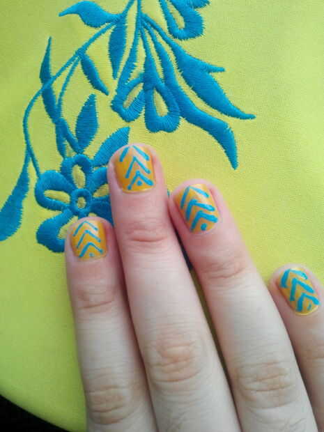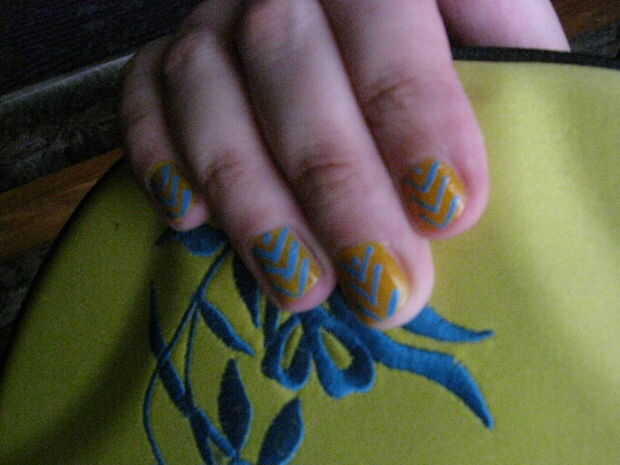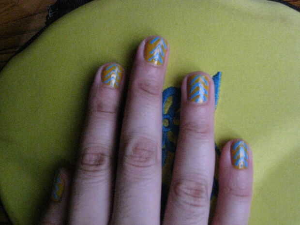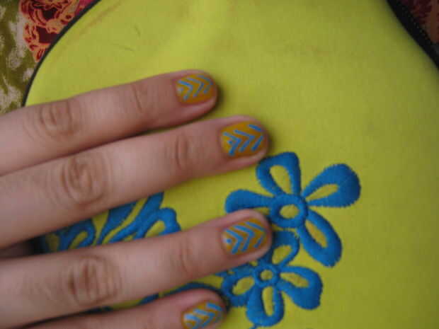 de uñas es divertido! No soy muy bueno en el arte de uñas pero pensé que sería divertido intentar algo que no sea esmalte para uñas. Por lo tanto, utilicé pintura de tela dorada con esmalte de uñas negro. Puede utilizar pintura de brillo también. Mis