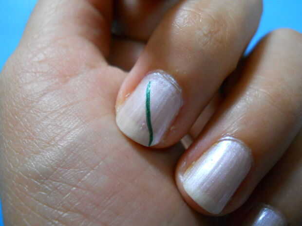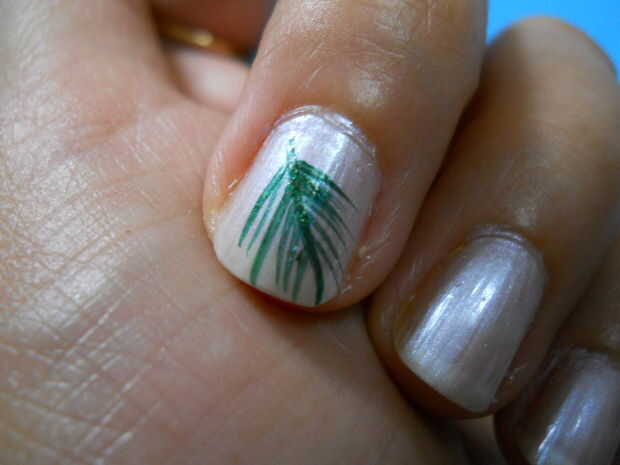 Use cepillo de striper y aplicar esmalte de uñas verde como se muestra. (dibujar línea inclinado. y luego hacer el diseño como si se dibuja el árbol de Palma)