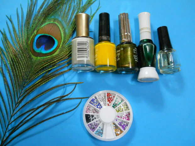 que no sea esmalte de uñas y esmalte transparente (capa superior) necesitamos uñas kit de arte (gema nail art kit) y esmalte de uñas pincel de striper.