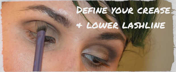 Con un cepillo de pliegue o un cepillo pequeño sombra de ojos, mezcla débil en su pliegue y luego apártese de su pliegue externo bajo tus pestanas inferiores.