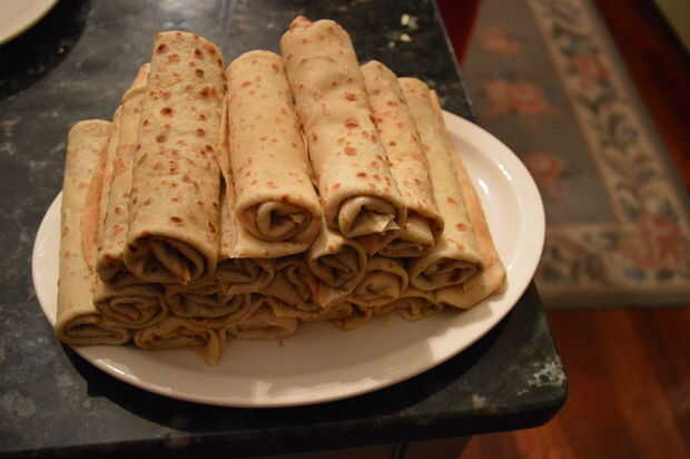 Poner 1/2 cucharada de relleno sobre la parte delantera y media de un panqueque. Doble la parte superior hacia abajo sobre el relleno. Luego doble los lados izquierdo y derecho en hacia el centro; acabar de liar la crepe de adelante hacia atrás. ¡ Repita!