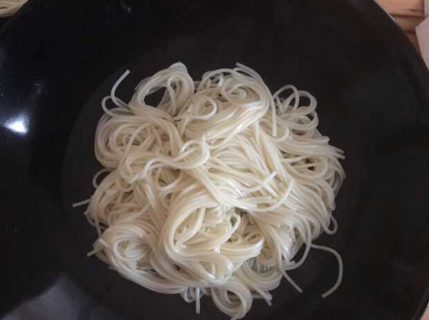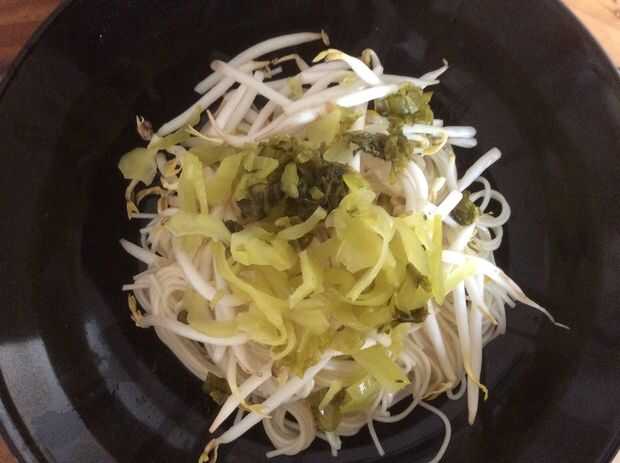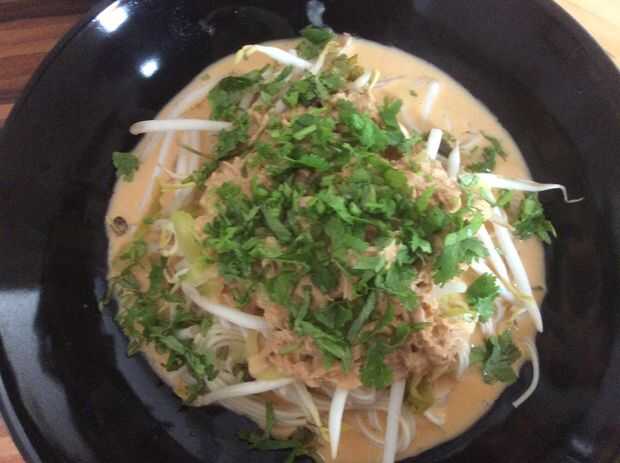 Coloque sus fideos, encurtido mostaza, curry (sin la raíz de cilantro!), hojas de cilantro, cebolla frita (opcional)