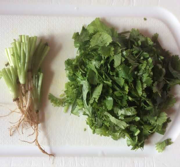 2) Lave y rebane el cilantro (excepto las raíces)