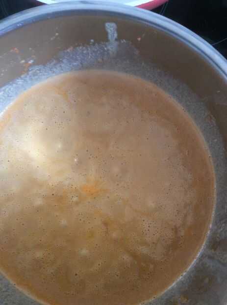 3) añada la primera leche de coco 500 ml, convertir en fuego alto, hasta que empiece a ver algún aceite y crema en la parte superior de su curry ((este paso ayuda a la grasa de la leche de coco lanzando hacia fuera, complica el curry y que huele mejor))