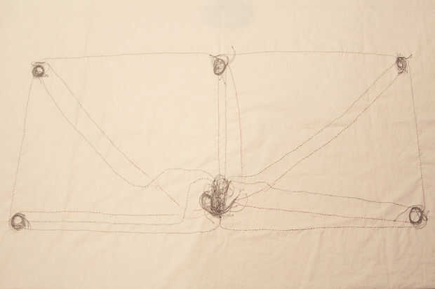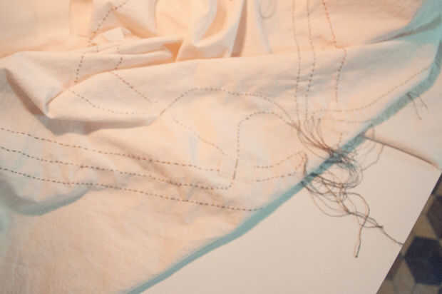 Empezar por coser el hilo conductor a través de todo el proyecto. Asegúrese de dejar una buena cantidad de hilo al principio y al final de cada línea para posteriormente coser el componnents. Tenga cuidado para no cross-coser cualquier línea - si no puede evitarse, coser un pequeño "puente" de textil por encima de una línea (cosa que por encima de él).