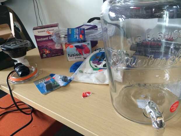 Ya que tienes que esperar toda la noche de todos modos para que el pegamento se seque, ahora es un buen momento para empezar a mezclar la mezcla de sal. NO UTILICE AGUA DE FREGADERO. ordinario de la ciudad el agua tiene elementos tóxicos imbuidos en él con fines"sanitarios". Es no apto para sostener vida marina.