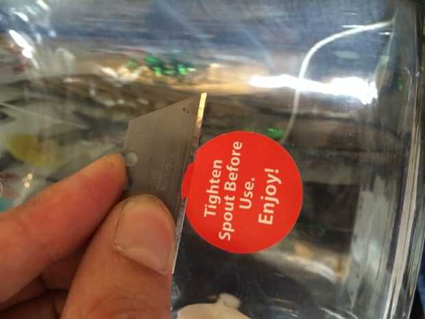 - Utilice una cuchilla para quitar cualquier y todas las etiquetas engomadas de la jarra de vidrio.