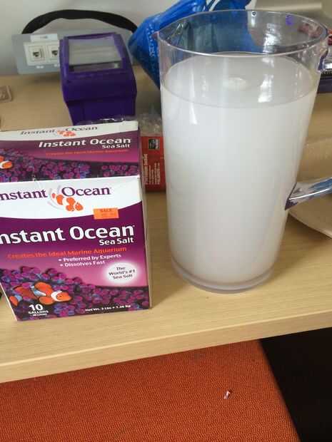 1. usando agua RO/DI (si no tienes un filtro capaz de eliminar todos los elementos de rastro se pueden comprar por galón a más tiendas de abarrotes) siga las instrucciones en el paquete de sal para hacer una solución que tiene salinidad 1.024. 1/2 taza de sal por cada galón de agua.