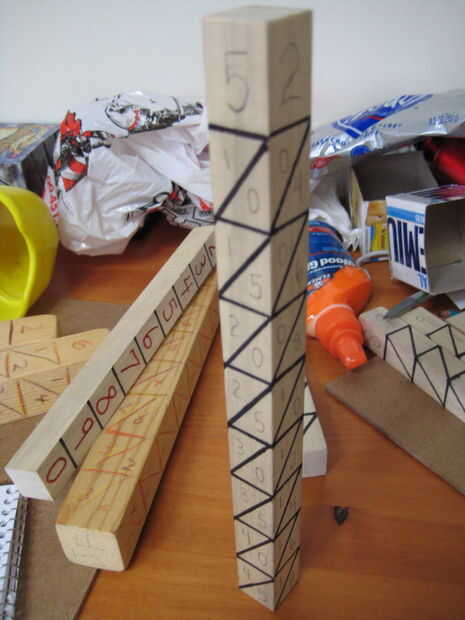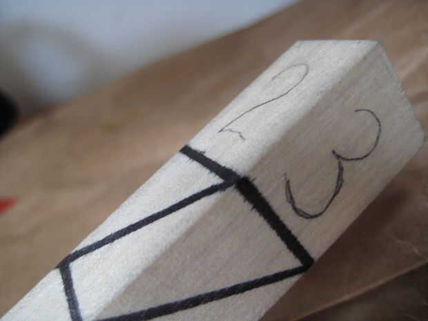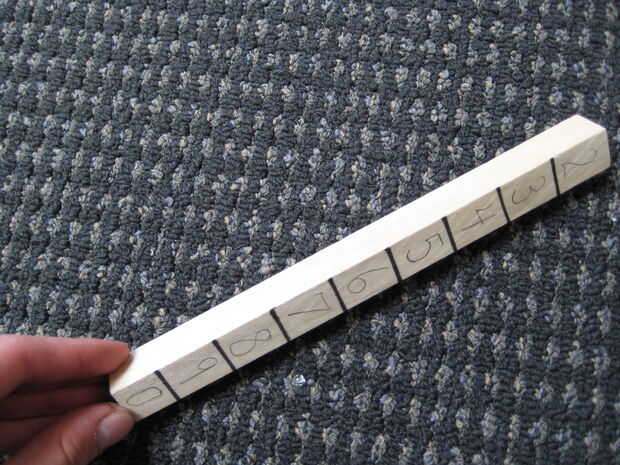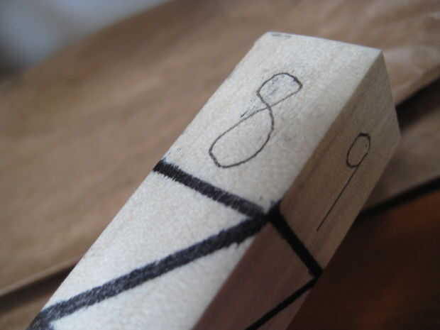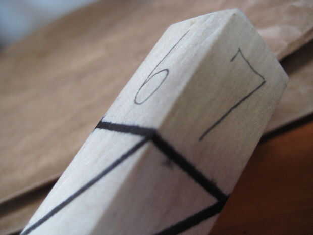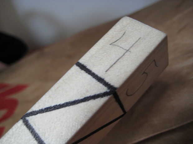 Tome uno de los restantes 9" las piezas y dibujar el número 2 en el cuadro superior de un lado. Girar la pieza 90 grados y dibuja el número 3 en el cuadro superior de ese lado. Repita con el 4 y 5 y los otros dos lados.