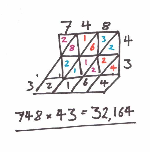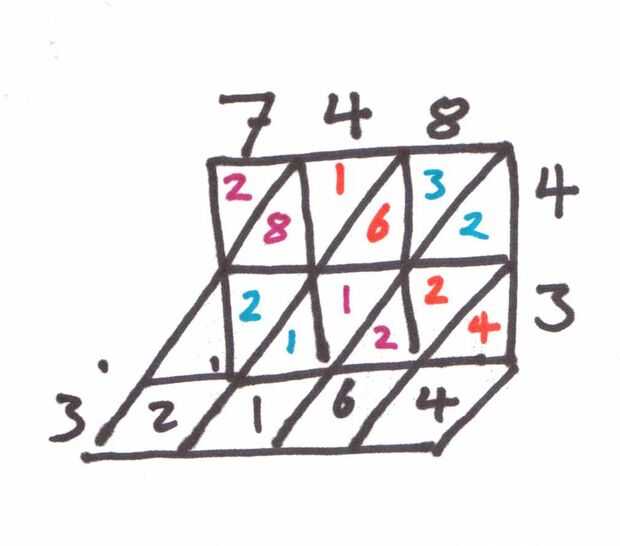 Si el total es más de 9, llevan los dígitos adicionales sobre a la siguiente diagonal y agregarlos en.