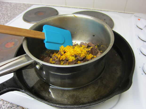 Añadir la ralladura de naranja y mantequilla o margarina al chocolate derretido. El chocolate será probablemente agarrar y asqueroso y tal vez un poco como poo (ver foto). NO TE ASUSTES!