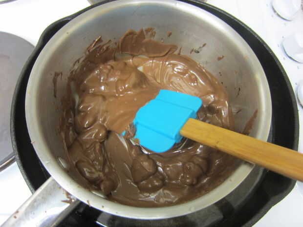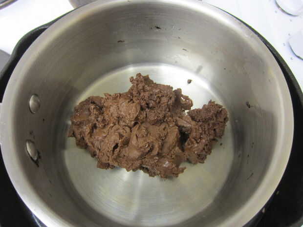 Retirar del fuego. Agregar el agua tibia (o leche y crema si desea un relleno más rico) hasta que el chocolate se empieza a ver again(see photo) liso y brillante.