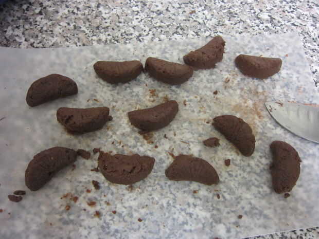 Usted puede recordar que ponemos unas trufas de chocolate naranja en la nevera. Puede comprobar en ellos ahora y si parecen sólidos los pop fuera del molde. Si algunos resultan un poco grumos, suavemente puede reformarlos. Luego ponerlos en un plato o bandeja y pop en la nevera. Que quieras ser muy frío antes de la capa de chocolate y montaje con las cáscaras.