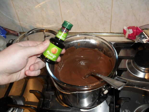 Para obtener un sabor anaranjado realmente puse casi la mitad de una botella de sabor naranja en mi chocolate, pero le aconsejo poner un poco más, cata, entonces si es necesario poner en abit más hasta que se cumplan. ¿Si desea, en lugar de utilizar aromas de naranja y chocolate en lugar de ello se puede utilizar una naranja Chocolate Terrys? Para hacer la trufa un poco más travieso pongo en un glog abundante de Triple sec... (siempre podría utilizar Cointreau) en mi brazo de gitano / mezcla de mazapán