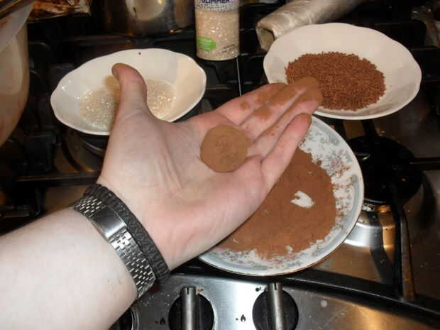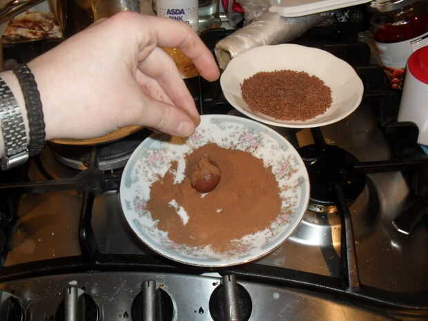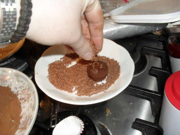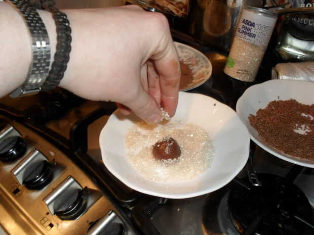 Entonces rodó la trufa en platos de deliciosos ingredientes, en una placa que tenía cacao en polvo, uno tenía fideos de chocolate y uno tenía cristales de azúcar. Me aseguré de que ellos donde igualmente revestido entonces apareció en un caso de Petit-four.