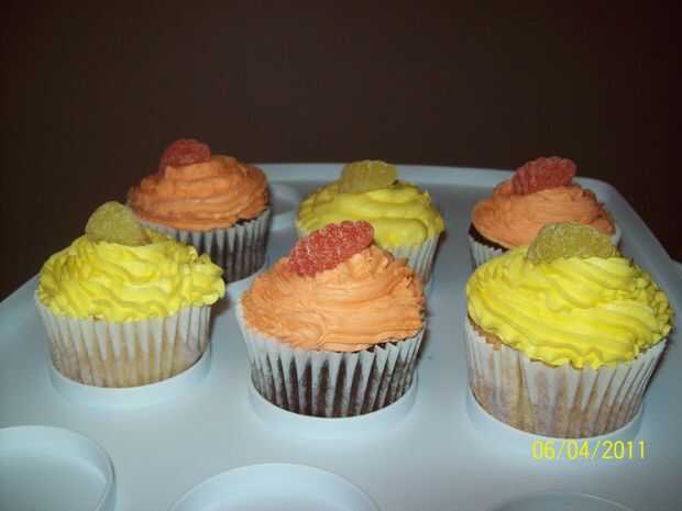 5. Utilice una punta estrella para bolsa de hielo y remolino naranja glaseado en los cupcakes de chocolate y glaseado amarillo/limón en los cupcakes de vainilla.