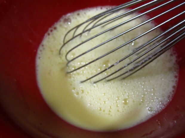 5. cuando se incorpora la mitad de la leche caramelo, bata la mezcla de huevo en la leche restante en la sartén.