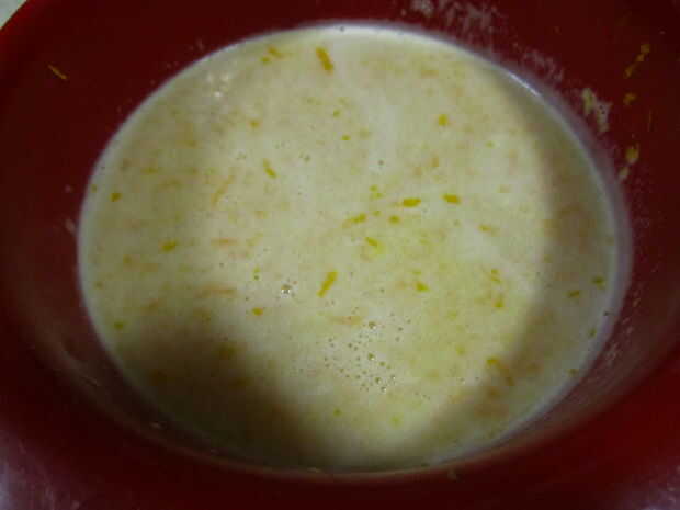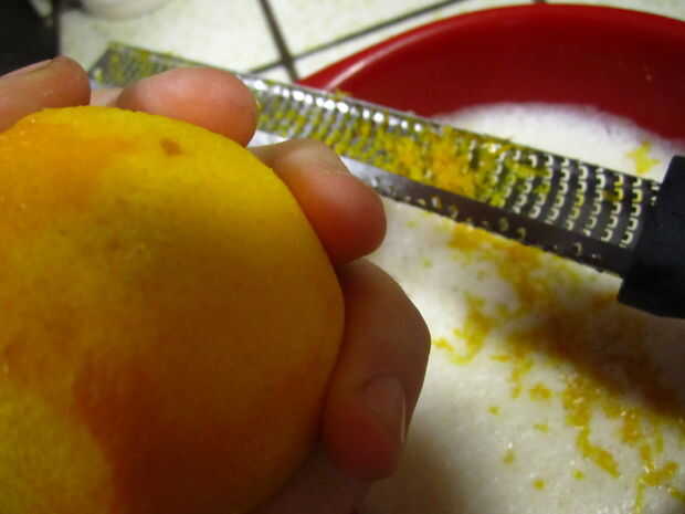 8. cuando se ejecuta un dedo a través de la parte posterior de la espátula y deje una línea, retirar la sartén del fuego. Usando un micro cepillo, cáscara ligeramente 3 naranjas a la crema. Tenga cuidado de no presionar demasiado: el mejor sabor es en los aceites de los superficie.