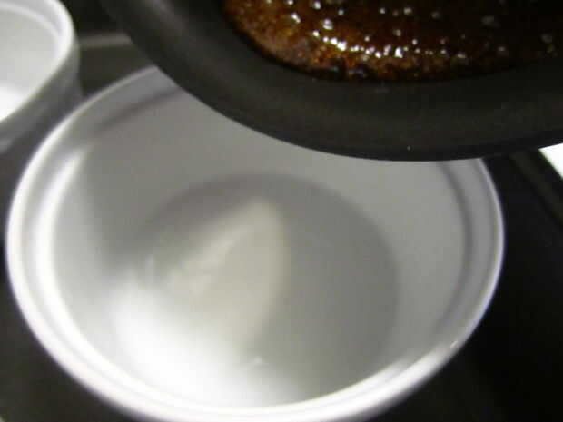 4. distribuir el almíbar uniformemente en el fondo de los moldes.