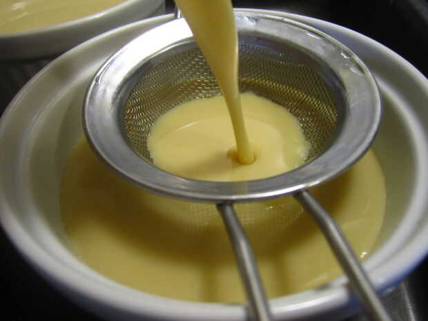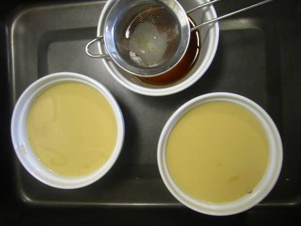 2. Vierta la mezcla enfriada a través de un tamiz sobre el gastrique balsámico en los moldes.