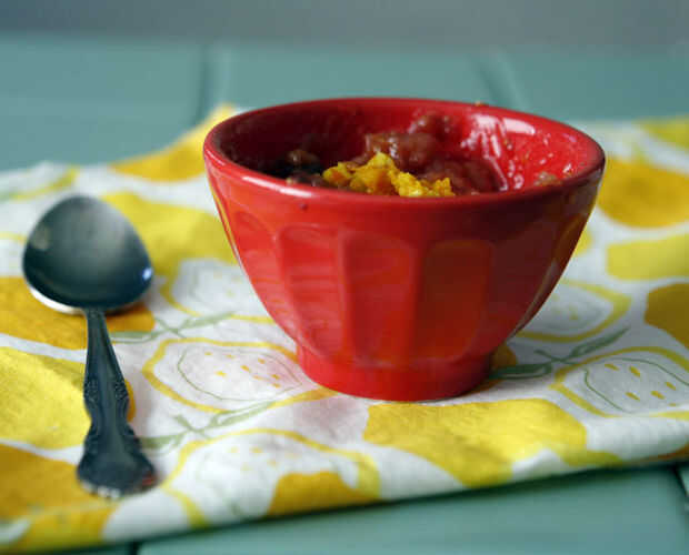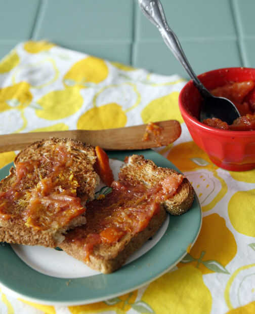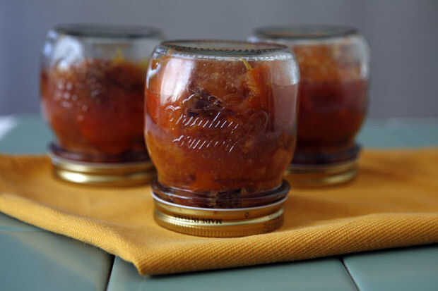 Mientras se revuelve, presione hacia abajo las piezas naranja para liberar el jugo. Tan pronto como usted está satisfecho con la textura de la salsa picante (es decir va a ser grueso, para separarse en las carnes!), apagar el fuego asegurándose de que los frascos/párpados están listos para rellenarse.