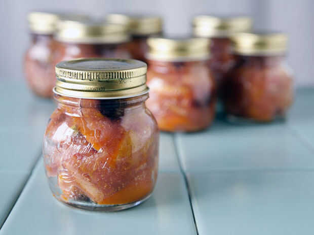 Una vez que el agua haya hervido, baje a fuego lento y guardar los frascos en el agua durante cinco minutos. Cuando el chutney esté listo, retire cada tarro y tapa uno por uno sobre un paño limpio, lado derecho, para mantenerlos tan estéril como sea posible.