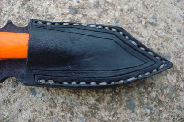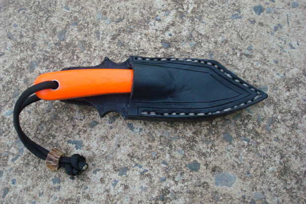 esto es un cuchillo recientemente hizo entonces vendido (derecha de mi cinturón, literalmente). El acero es un antiguo fichero de Nicholson, el pin es ss, es de mango micarta casera fluorescente naranja, es de la cuerda paracord negro con una tira de deerhorn.
