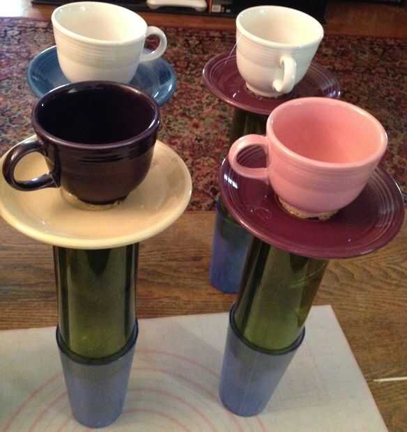 Alternativamente, podría colocar un ensamblado taza/plato taza-lado abajo y coloque el fondo pegajoso de la botella de vino en la parte inferior del platillo. Todo depende de si o no el platillo se sienta plana--usted no quiere el vino de la botella para deslizar hacia un lado. ¿O tal vez hacer?