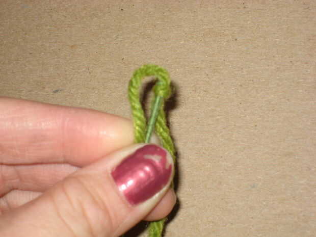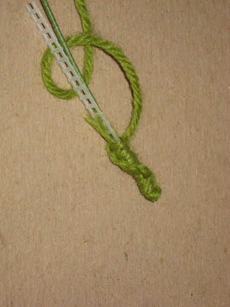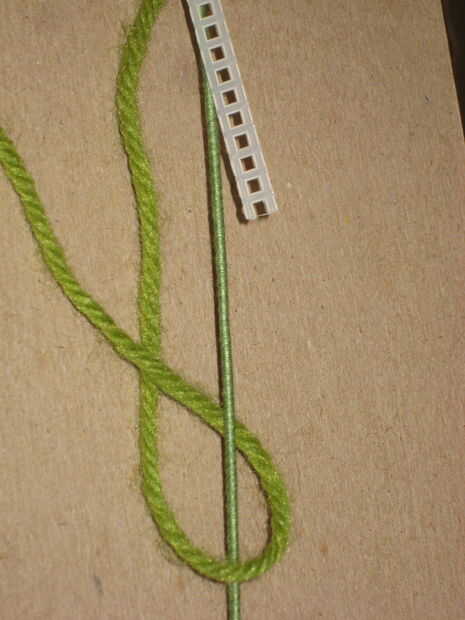 Primero até un nudo en la punta del alambre con el hilo, luego pongo el hilo sobre la parte superior para intentar escondió el extremo del alambre. Usé un nudo básico, visto en el tercer cuadro y sólo hizo una y otra vez. Resbaló la lona de plástico en al principio y anudada justo sobre ella. Esto le dio a la parte superior de la hoja de algún espesor.