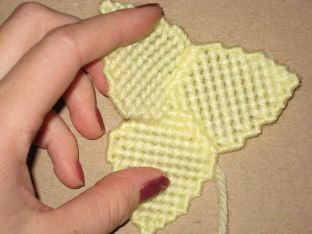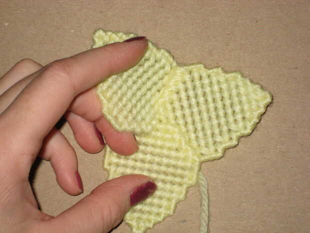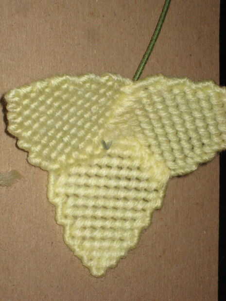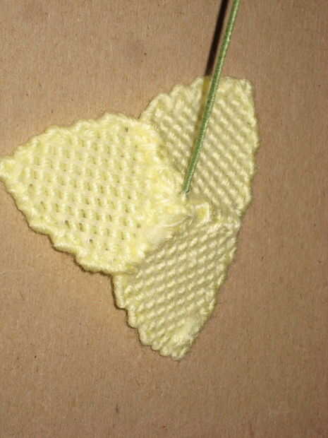 Puede haber diferentes formas de conectar el tallo y uno de ellos es seguir a través del centro de los pétalos de tres ahora y sólo lo cosa con hilo amarillo. Coloqué en había lo había doblado e intentó tejer en algunos de los puntos de sutura en la parte superior de la flor (en el tazón de fuente). Puede ser desordenado con la costura, pero el centro será cubierto una vez que el pedazo de centro se cose en.