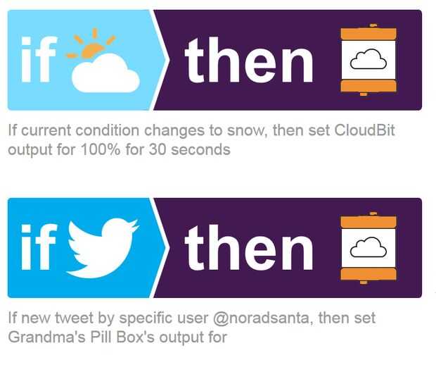 Hay un montón de canales en IFTTT. Incluso podría hacer una receta que hace de Rudolph la nariz brilla cuando hay nieve! Trate de hacer una receta usando el canal del tiempo - si las condiciones de corriente en tu zona = nieve a continuación, establezca CloudBit salida a 100% durante 30 segundos.