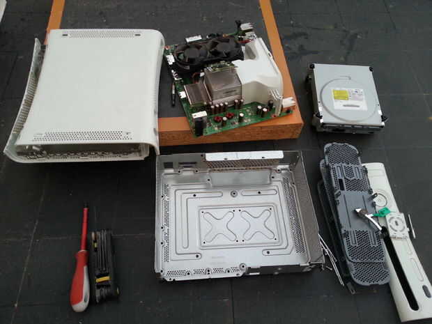 desmontar y vaciar completamente el interior de la xbox. Conserve todos los plásticos, pero desmonta todos los componentes (placa base, ventilador, unidad óptica)
