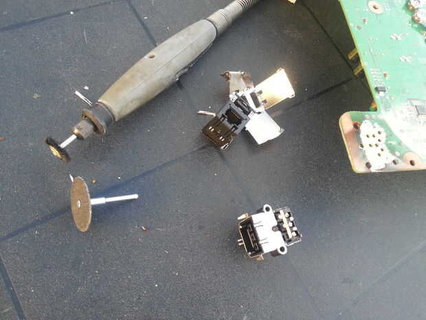 No he conseguido derretir la soldadura con un soldador, he utilizado una herramienta dremel para cavar la superficie posterior de la placa base, pero he roto uno de los pines de la fuente de alimentación, (aislado con un pedazo de madera, fija con pegamento)