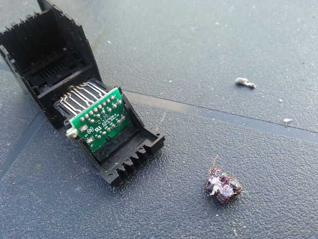 quitar cualquier componente en su lugar en el puerto de Ethernet, retire todos los rastros de pegamento y si queda cobre cable ethernet pcb.