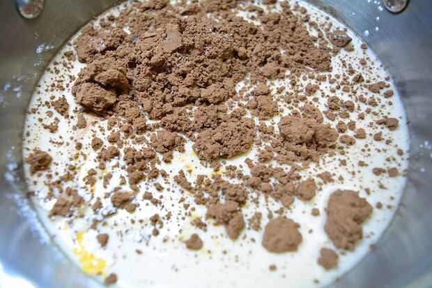 Mezclar (2 tazas de leche, 2 cucharadas de natillas en polvo, 4 cucharaditas de azúcar o poco más, 2 1/2 cucharadas cacao en polvo)