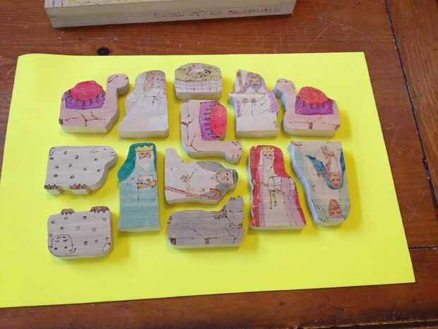 Para crear una pantalla independiente debe tener una pieza para cada persona (o dos personas) que se encajan dentro del marco en forma estable. Puede empezar dibujando el contorno estable de rompecabezas y llevar piezas de un a un tiempo en el espacio abierto hasta que tenga un diseño de trabajo. Consideré a dibujar una escena de la Natividad y luego simplemente cortarlo hacia fuera en pedazos, pero quería las piezas del rompecabezas para funcionar también como una pantalla de Natividad con figuras completos independientes.