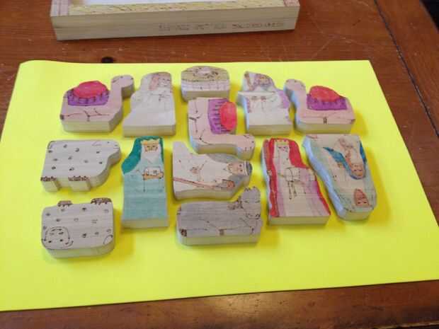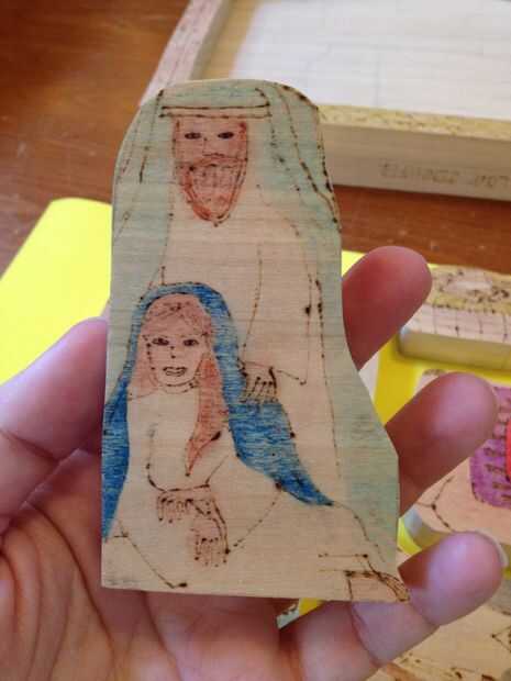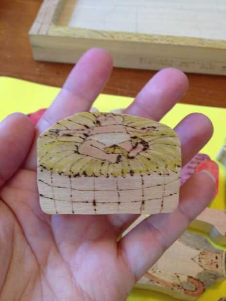A continuación tomar la herramienta de leña y dibujar sus diseños en las piezas de su rompecabezas. Uso de color las manchas para añadir algún detalle a las piezas. Quemé patrones de grano de madera en la parte superior y laterales de la carcasa para que se vea como una madera estable. Entonces se quema líneas parece paja en la parte inferior del marco. También volcó el marco y quemó más líneas de heno en la parte trasera para que cuando se configura la escena de la Natividad se ve como la gente está en heno en el establo.
