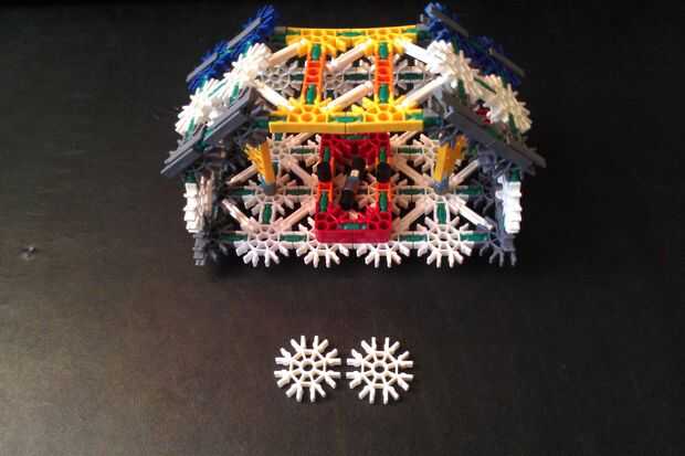 Construir el pedazo de centro del techo y adjuntar al resto de la Natividad con barras verdes. A continuación, tomar dos conectores blancos y arco sobre el techo con barras verdes.