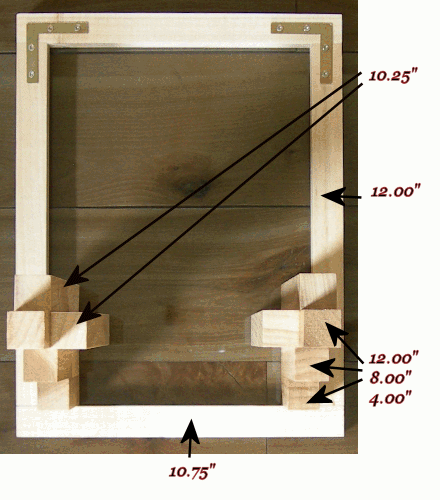 Tenga en cuenta que las dimensiones solamente que son específicas a la Giant XtC son la 10,25" canalización vertical que la suspensión se basa en y el ancho de la estructura de la bicicleta en el punto de apoyo. Las otras longitudes no son críticas. De hecho, casi todos mis pedazos de madera son más cortos que las dimensiones señaladas aquí. Yo he enumerado las dimensiones independientemente de corte hoja de sierra - hace que la anchura del corte de la sierra a través de la madera. Cortar una longitud de 12" de madera en 4" y 8" piezas resultados en dos piezas que son ligeramente más cortos de 4 y 8 pulgadas. Las dimensiones importantes son la altura de la bicicleta marco soporte canalización vertical (aquí 10,25"), la anchura de las tabicas de 12" que el marco de la bici se encuentra entre, y la longitud de los extremos del bastidor (aquí 10,75"). La última dimensión está regida por el ancho del marco de bicicleta donde elegir para que lo apoyen; en mi caso, la anchura del bastidor en el punto de apoyo es 6,75", incluyendo aproximadamente de 0.125" (1/8") de mayor espacio para hacer más fácil deslizar la moto dentro y fuera del stand.