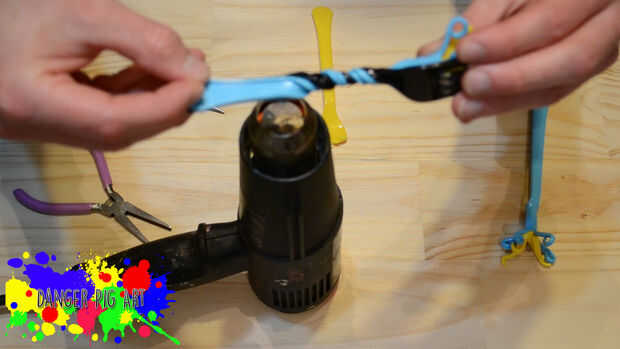 Una vez que termine los rizos sostienen un tenedor negro y uno de los tenedores azul con las caras de las horquillas hacia la otra. Mueva hacia adelante y hacia atrás sobre el calor, gire la horquilla como calentarlo para que pueda obtener todos los lados calentados igualmente. Cuando dos horquillas se calientan uniformemente comienzan a girar. La forma más sencilla es muy la parte posterior de la horquilla con pinzas y rotación de la base y puntas de las horquillas. Una vez que lo tienes torcido por lo menos dos tercios de la manera abajo de la horquilla dejarlo enfriar y hacer lo mismo a la otra horquilla azul.