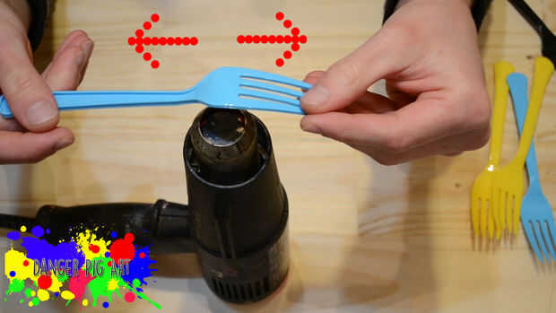 Mantenga la horquilla azul a 1-2 pulgadas de la calor y trabajar hacia adelante y hacia atrás en la base de la horquilla. Voltee y calentar ambos lados igualmente. Esta primera bifurcación será parte del tallo y la parte principal de las flores.