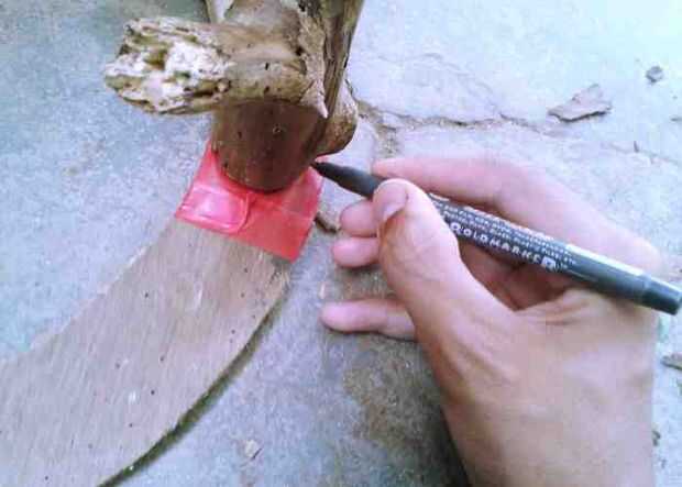 Ahora tienes uñas muy cuidadosamente, para hacer esto primero sólo firmemente cinta la superficie curvada justo detrás de la sección transversal (se me ocurrió esta idea cuando rompo la rama poco pedacito.) para asegurar que la rama no se rompe por los lados cuando. (Antes de martillar la cinta demasiado la base si la base es débil. Luego pintura sobre él en el último por lo que es no quedar mal.) Entonces, martillo los tornillos en la base primero, y después poniendo la rama detrás de él. (Es difícil porque tienes que mantener la rama en la mano invertida y martíllelo). Cuando termines con él solo tome una respiración profunda hacer que han hecho la parte más difícil.