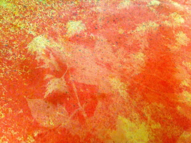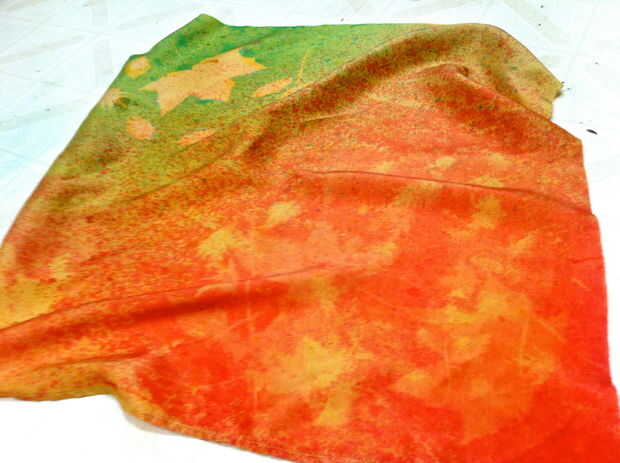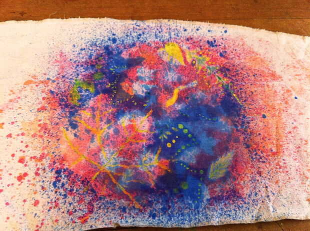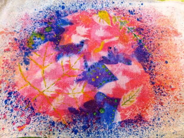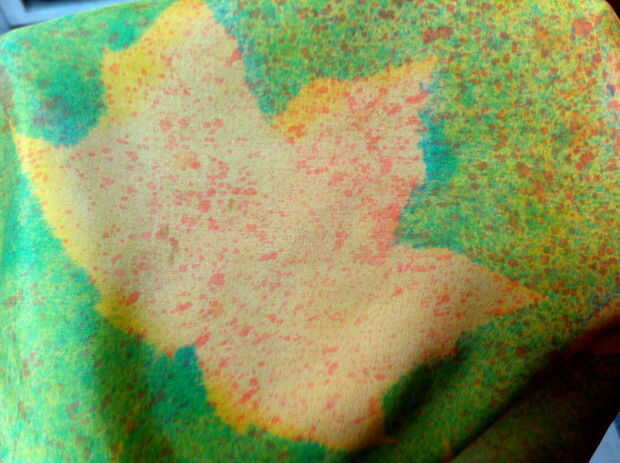 Mi primer proyecto, una vez que había hecho algunas pequeñas muestras para probar las propiedades de la tinta en diferentes tejidos, fue la hoja temática salpicaduras. Quería uno de seda y de lino. Ambas piezas de tela eran de artículos de segunda mano tienda de ropa. La seda dobladillada y utilizada como un bufanda/pañuelo de juego para mis hijos. La ropa se convertirá en el lado de una bolsa. Mi mamá es una amenaza a algún tipo de revuelta si ella no consigue la bolsa de lino de la impresión.