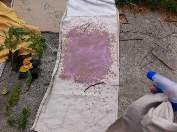 Rociar el tinte sobre la tela, siempre que lo desee. El tinte es un color más claro antes de que reacciona a la luz UV, pero todavía es bien visible en la tela. Rápidamente arreglar las hojas sobre el tinte rociado, después coloque el vaso encima de ellos, aplanarlos.