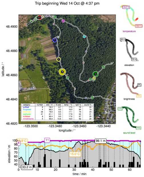 El lado parcelas separado los datos de elevación, temperatura y nivel de sonido, brillo y complot contra la posición. Para mayor claridad, véase la segunda figura, donde han sido extraídos de la trama principal y ampliado. Temperatura, altitud, número de satélites y un histograma de eventos se trazan contra el tiempo en el gráfico inferior.