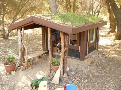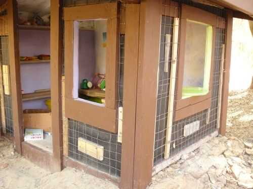 También se puede ver que he traído en las rocas y la tierra alrededor de la base de la casita. Esto le da más masa térmica, que es cómo esta estructura se mantiene fresca durante el verano. Masa térmica absorberá el calor y liberarlo por la noche.