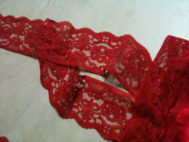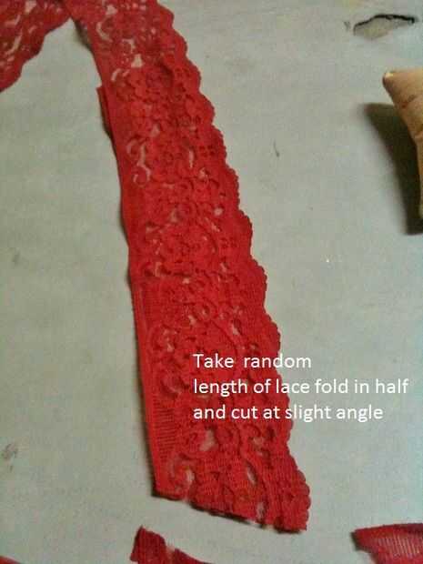 cortar una longitud al azar del cordón y doblar por la mitad y corte un ángulo... lugar justo después del cordón en el frente y coser el encaje