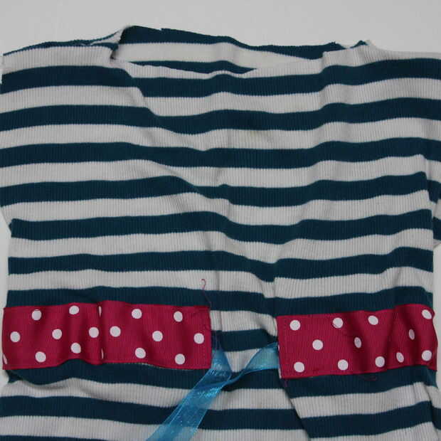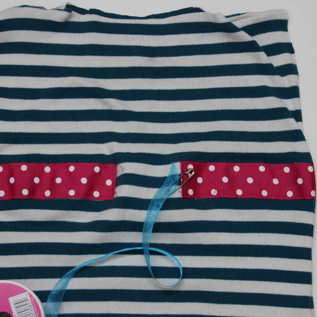 12. Repita los pasos 9 a 11 para las sisas así. YEP! Me di cuenta que no me importaba que tanto para la cinta de color turquesa, por lo que intercambiar para la cebra rosa imprimir del grosgrain. Si no utilizas una prenda ya cercada, terminar el dobladillo con su método preferido, si está trabajando con tejidos de punto, podría también lo dejas cruda, ya que los tejidos no fray. Sin embargo un dobladillo terminado da más definición a la ropa así que lo recomendaría.